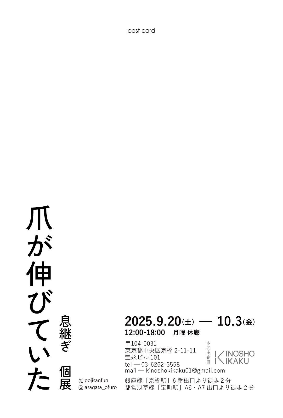 木之庄企畫では2025年9月20日(土)より、息継ぎ個展「爪が伸びていた」を開催致します。
