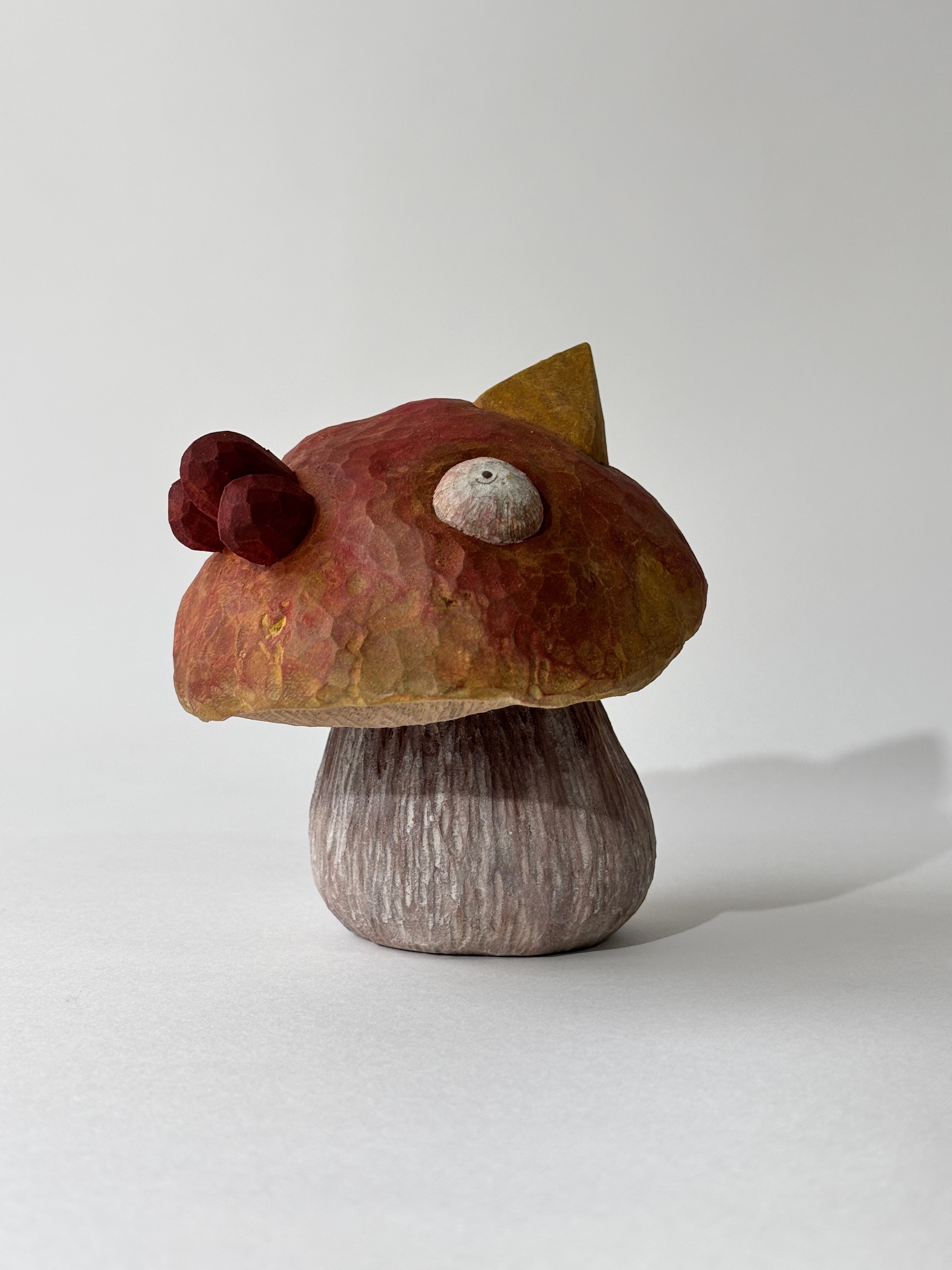 茸鳥シリーズ作品は、楠木の温もりと岩絵具の質感が融合し、幻想的な造形を生み出している。茸の頭部に鳥の意匠を重ねたデザインは、進化の曖昧さや生物の変容を象徴し、童話的な遊び心と哲学的な奥行きを兼ね備える。奈良時代後期から平安時代前期の「一木造」 技法を用い、茸鳥ユニークな個性を作品に捉え、使用木材の違いにより作品ごとに独特の質感と香りを持たせている。